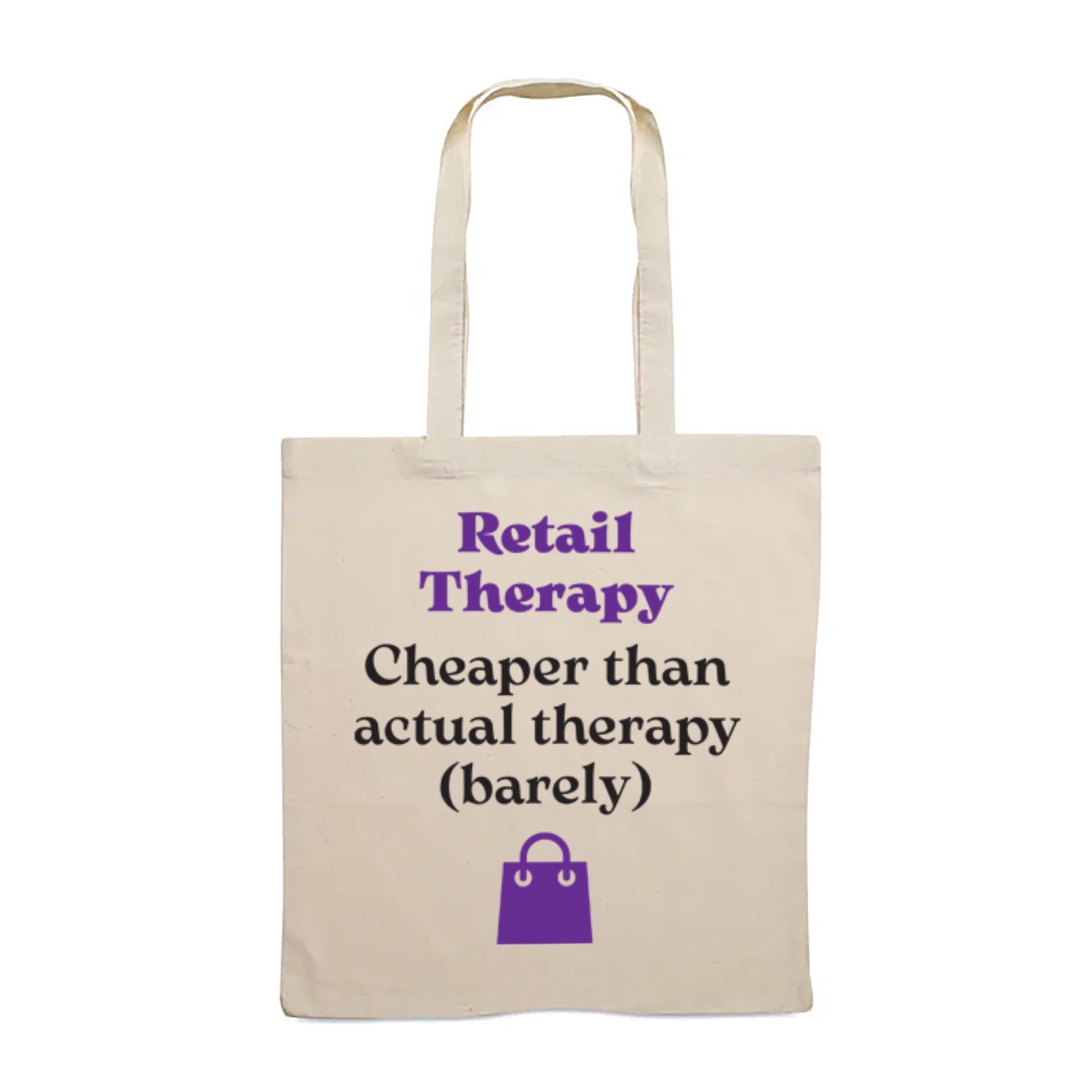 Who needs a therapist when you’ve got a shopping spree? This witty tote bag says it all: “Retail Therapy – Cheaper than actual therapy (barely).” Perfect for hauling your latest finds, carrying books, or adding a touch of humour to your daily errands.